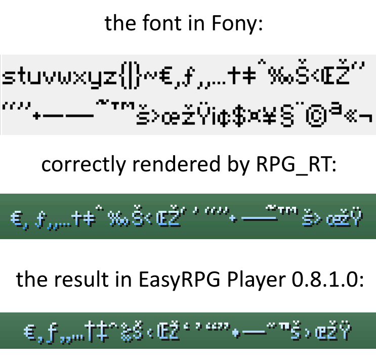 I’m using a custom pixel font with EasyRPG Player 0.8.1.0, but there seems to be some confusion with the encoding: copepoints 0x80 through 0x9F don’t render the way they were designed in the font. It appears as if the player interprets the characters in-game as their Unicode positions, while the font file only provides codepage 1252 (the program I’m editing the font with, Fony, doesn’t allow anything outside 8-bit encoding to begin with). Oddly enough, setting “Encoding=1252” in RPG_RT.ini doesn’t change this behavior.